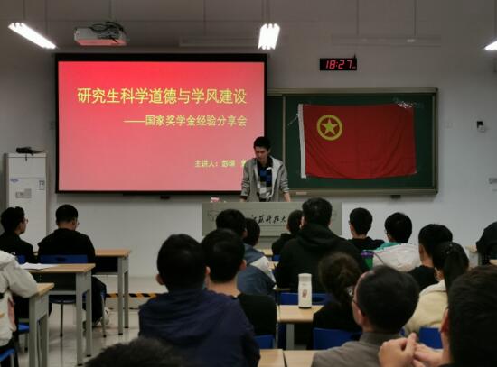 为推进2020年“研究生科学道德与学风建设”系列活动开展,进一步加强学院学风建设,bat365在线平台官方网站于2020年11月13日在学董事长山校区13号楼113教室举行国家奖学金获得者学习经验分享会。bat365在线平台官方网站2018级国家奖学金获得者彭琛、黄杨成以及2020级研究生全体参加分享会。活动由bat365在线平台官方网站2020级团支书谢丹主持。