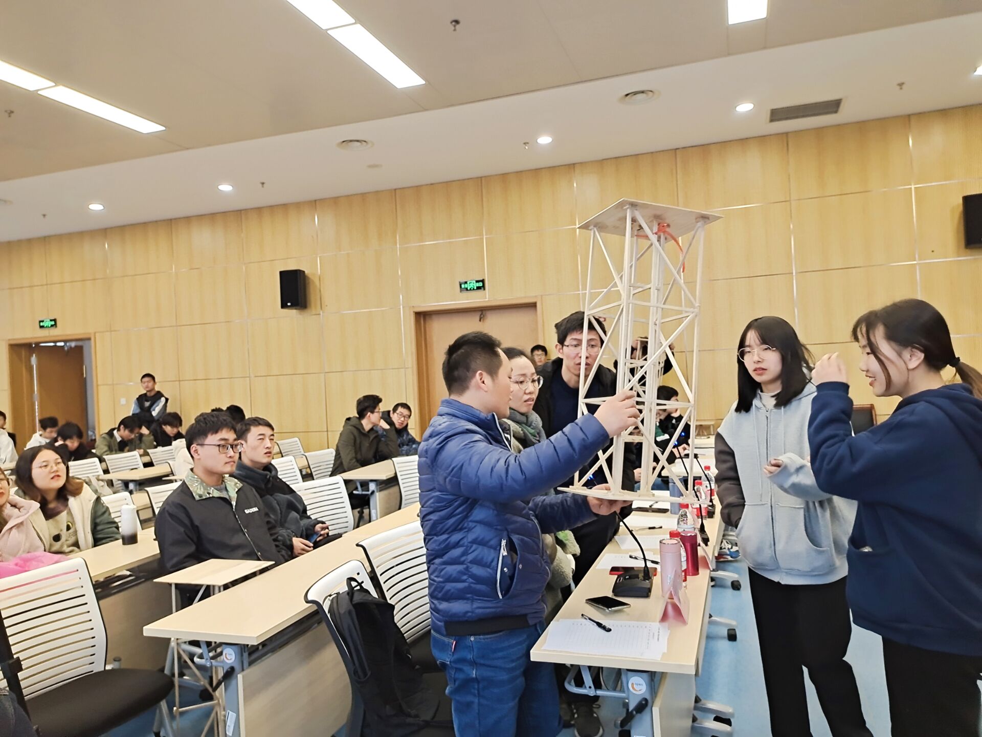 前来参赛的小组,在确保一定的承重基础上把参赛作品尽量减重。在签到以及模型承重后,决赛正式开始。首先是比赛最扣人心弦的承重环节,由参赛同学对模型承重的水平和竖向荷载自行选择,在一定程度上提高了比赛的难度。模型加载过程中,部分模型“吱嘎吱嘎”的摇晃声、“卡卡卡”的断裂声,令参赛同学压力倍增,但诸多小组模型的成功承重加载,又不断地鼓舞着同学们乐观参赛。随后,评委老师为参赛同学讲解模型作品结构存在的问题、破坏的形态及原因,并给予相应的专业指导。经过激烈的角逐,最终孙玉康同学代表小组斩获结构组一等奖,刘祖超同学代表小组斩获阻尼组一等奖。