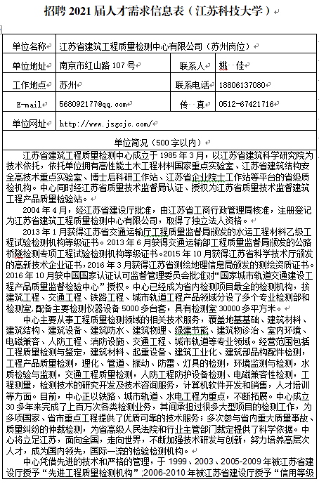 江苏省建筑工程质量检测中心有限公司(苏州岗位)2021年招聘公告