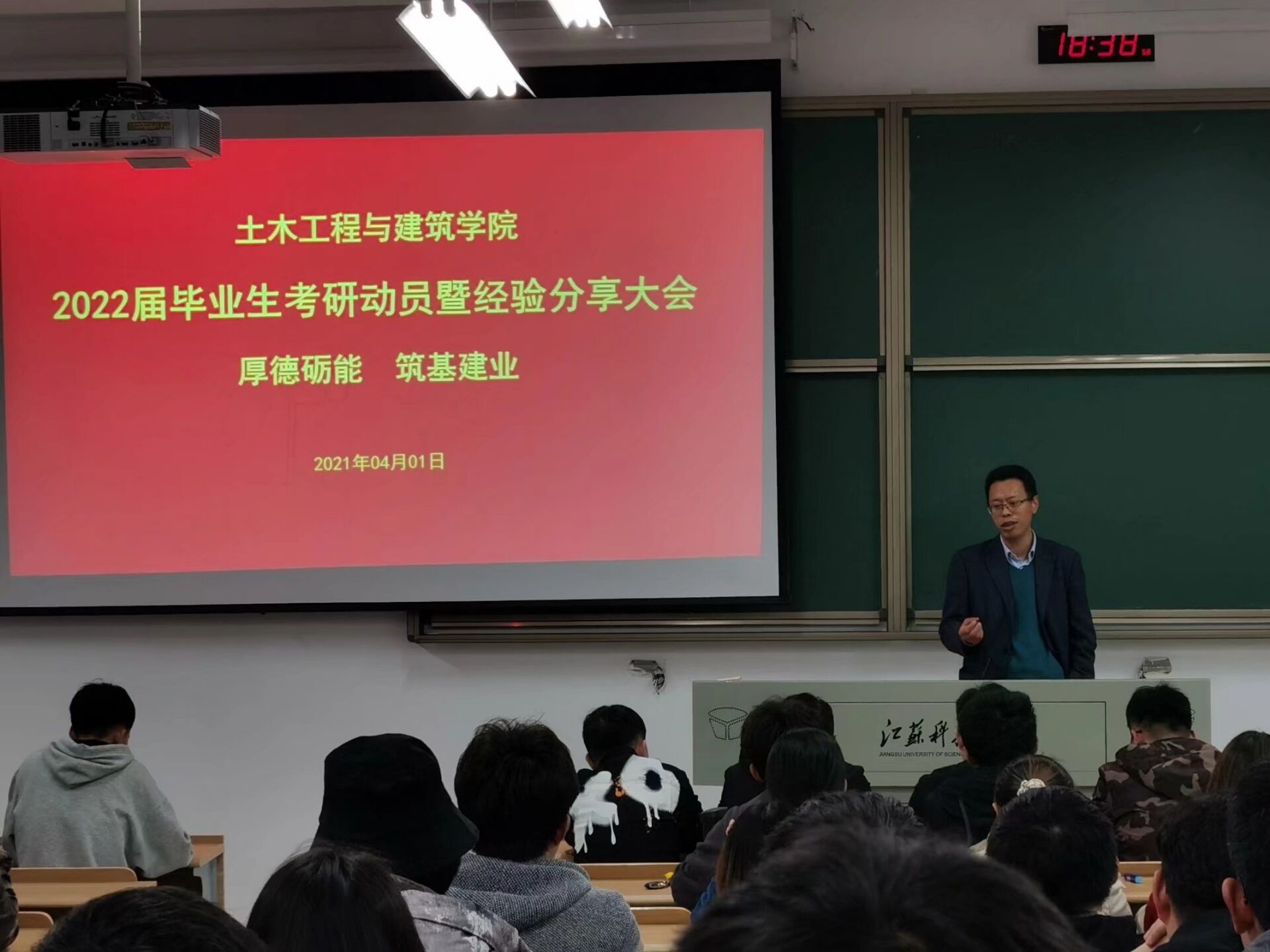4月1日晚,bat365在线平台官方网站在院团委、关工委的指导下于13号教学楼举办了2022届毕业生考研动员暨经验分享大会,党委副书记李红明出席并发表了考研动员讲话。本次大会还邀请到很多优秀员工前来与同学们进行经验分享,如相升冲、陆雯、弓美娟等。