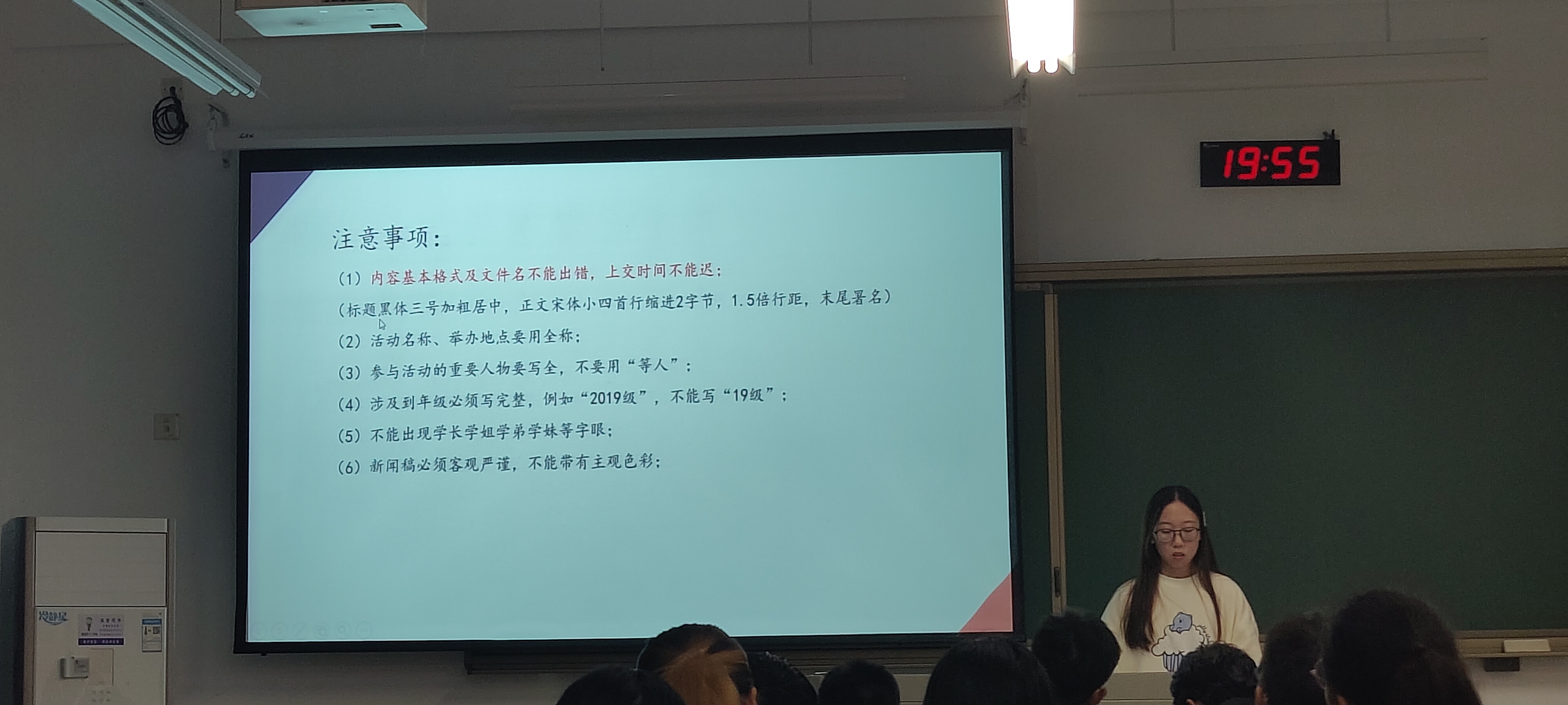 其次,邀请杨芳同学给大家介绍新闻稿写作的相关要求,字体,格式,词语应用,框架建立等方面的讲解,扫除大家在新闻稿写作时的很多盲区,便于大家在后面工作中更好解决问题。