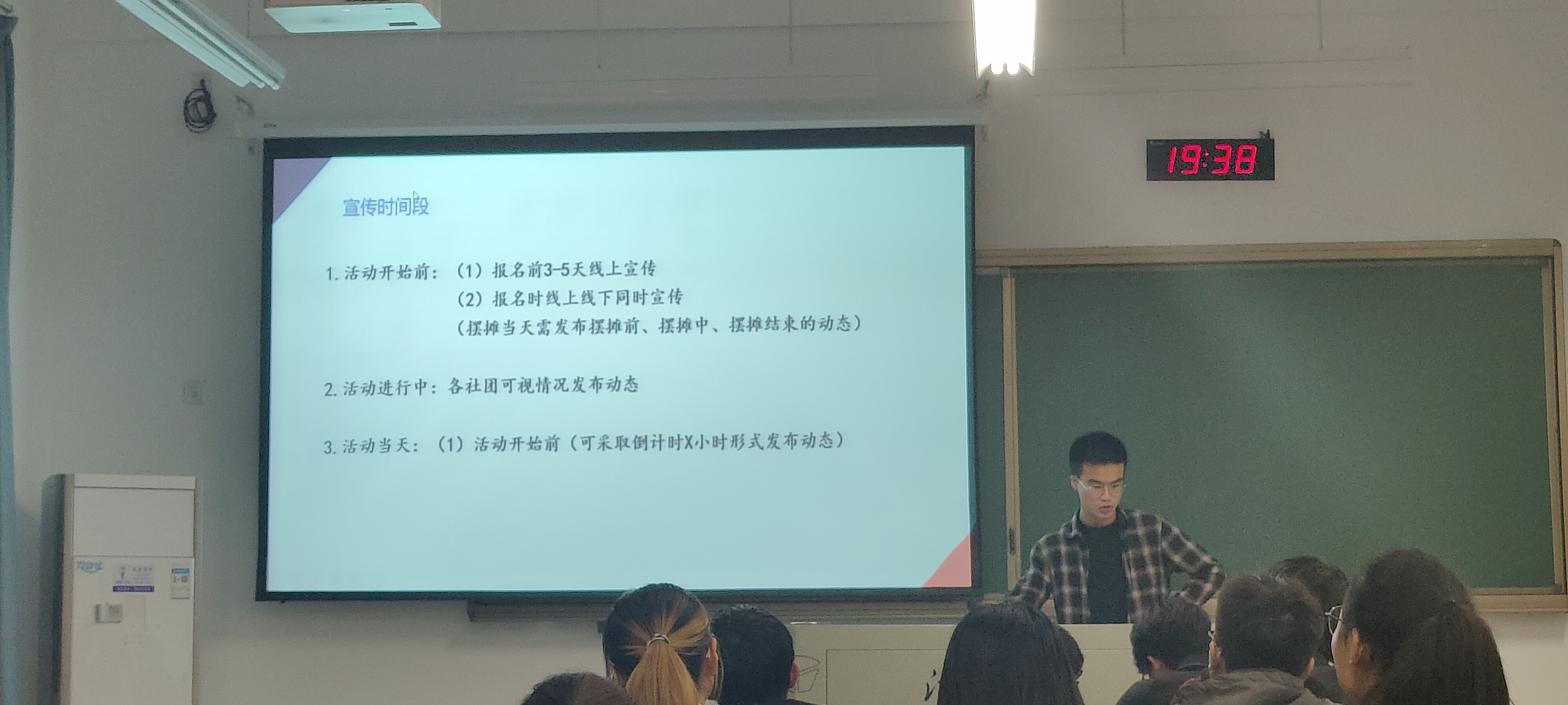 由于本学期第一次见面,会议开始大家先做了简单的自我介绍,让会议的气氛在此之中调动起来。随后,李兴隆介绍本次会议的议题,包括本学期工作规划,活动前期的材料准备,宣传的流程与渠道,活动产生的费用报销,新闻稿写作培训几个方面。并且一一围绕展开,给大家梳理活动开展前相关文件的填写规范和上交时间,开展活动的相关注意事项,线上宣传的事前准备,费用报销的规范整理等。