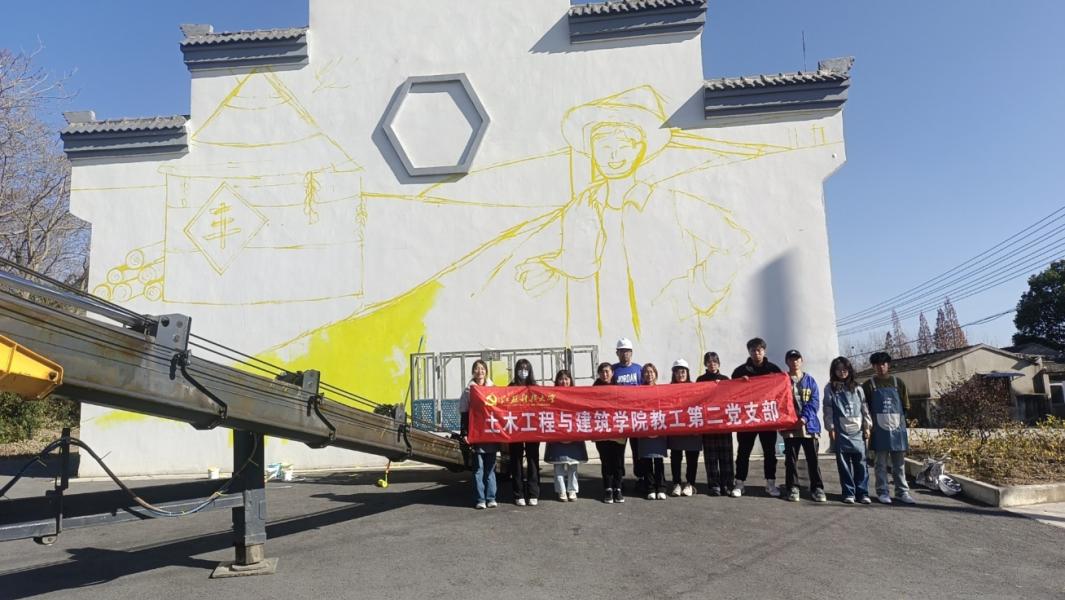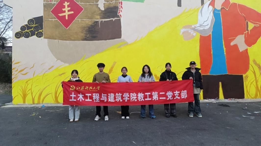 为改善乡村人居环境,艺术赋能乡村振兴,2023年12月8日,一场别开生面的墙绘活动正在镇江市丹徒区东古村如火如荼地展开。这次活动围绕“永远跟党走,奋进新时代”主题,由bat365在线平台官方网站教工二支部牵头,组织动员一批土建优秀学子走进乡村,用画笔描绘美丽乡村的崭新风貌,助力乡村文化振兴。(见图1)。