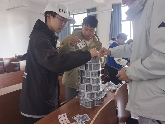 最终,经过激烈的角逐,以及评委对各组纸牌建筑的高度及美观度进行综合评分,吴浩东和唐金龙同学的小组斩获本次比赛的第一名。最后,比赛在大家的掌声与欢呼中圆满结束。
